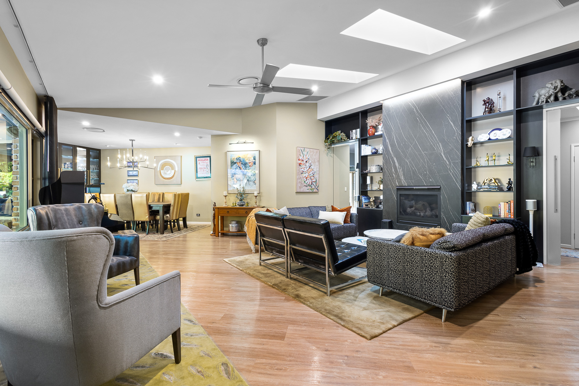 The lounge zone including a cosy fireplace for winter evenings and massive panorama window to take in the impressive pool deck.